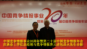 2014年10月28日,李紅總經理應邀參加由中國科技情報學會競爭情報分會主辦的中國競爭情報事業20周年暨第二十屆中國競爭情報年會慶典。會議邀請到了競爭情報資深專家包昌火研究員、張典耀研究員和繆其浩研究員,還邀請到了軍事科學院姜春良少將、北京大學光華管理學院董小英教授,以及來自美國的艾瑞克先生和陶慶久先生。會場金碧輝煌,近三百人濟濟一堂,見證了全國競爭情報界規模最大的行業盛會。