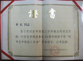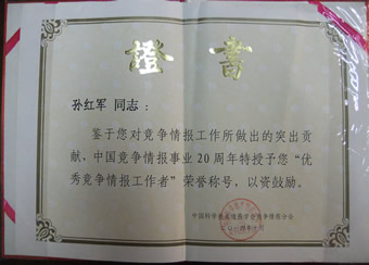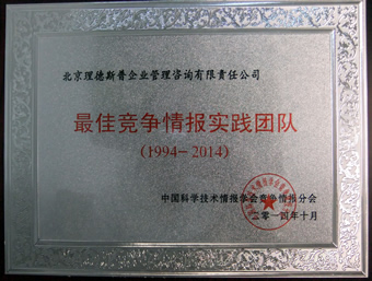 由于對競爭情報事業所做的突出貢獻,理德斯普公司榮獲“最佳競爭情報實踐團隊”獎,董事長孫紅軍和總經理李紅也分別被授予“優秀競爭情報工作者”榮譽稱號。